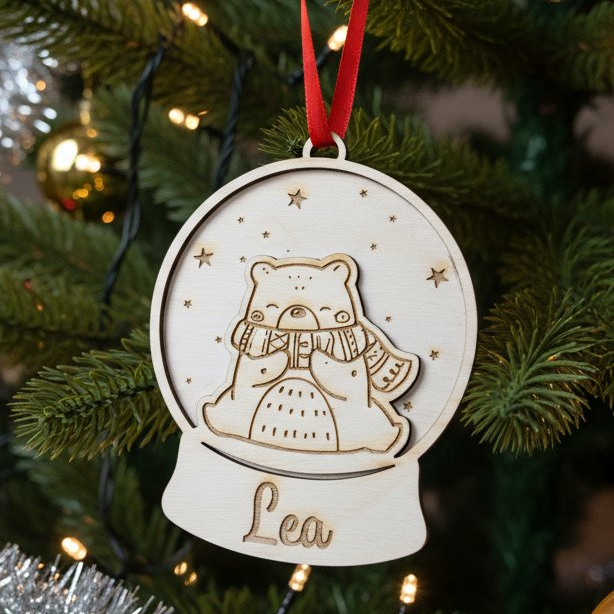 Drveni ukras za jelku sa imenom – Snežna kugla – Meda